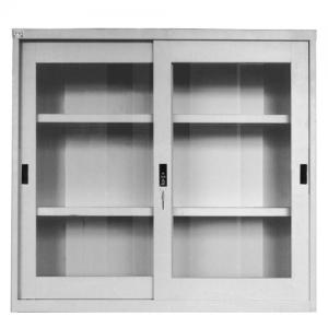 - Tủ sắt sơn tĩnh điện màu ghi, có 1 khối gồm 2 đợt di động, tủ có 2 cánh khung kính lùa.